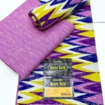Elevate your wardrobe with this stunning Classic Kente Gold African fabric, featuring a bold zig-zag pattern in rich purple, yellow, white, and navy blue. Paired with a matching textured pink fabric, this set is perfect for creating coordinated outfits with a luxurious, cultural aesthetic.