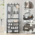 Clothes Hanger Multi-Layer Shoe Rack Doorway DIY Hat And Shoes Shelf Simple Floor-Standing Living Room Organizer Storage Racks Features:*1. Clear paint finish: The clear and delicate texture of the board’s clear paint finish is convenient for cleaning.*2. Smooth polishing: The edges and corners are smooth and polished to prevent collisions, which is designed very thoughtfully.*3. layers of storage: Large capacity storage space is classified and stored neatly.*4. Hook design: Neat storage for hanging bags and other items, convenient and convenient.*5. raised feet: The raised design at the bottom effectively prevents mold and moisture. Specification: Name: Floor Shoe and Hat Rack Material: PP plastic Colors: Black, White Layers: 3 layers/4 layers/5 layers Packing included:1 * Floor Shoe and Hat RackNotes:1. Please allowed 1-3mm differences due to manual measurement, thank you for your understanding!2. Due to the difference between different monitors, please understand that the picture may not reflect the actual color of the item.